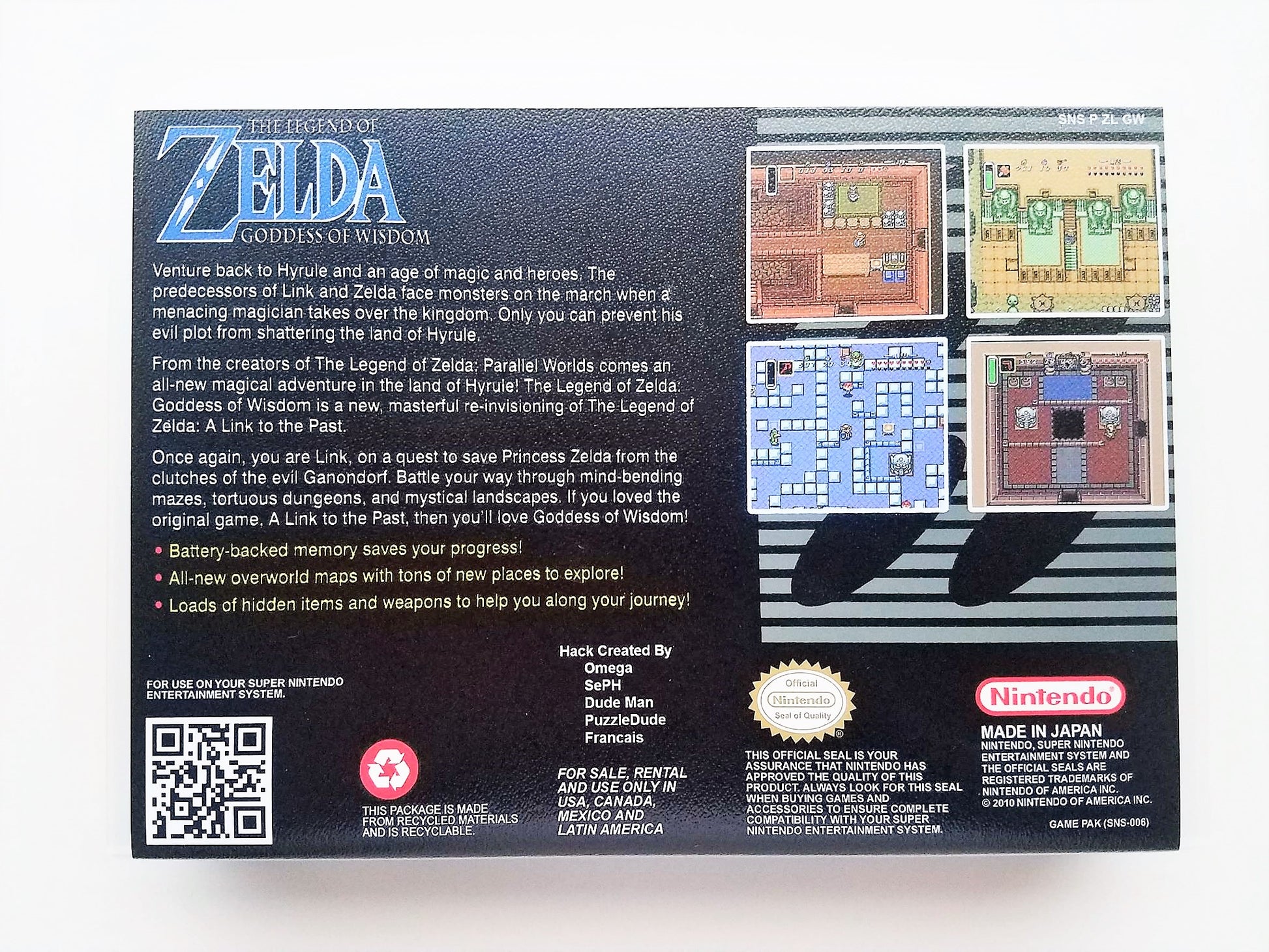 Goddess of Wisdom provides countless hours of new content for Zelda fans! This is considered by many to be one of the best remakes. Come follow Link through yet another new adventure and put your skills to the test, as Goddess of Wisdom doesn't hold your hand like the modern Zelda games!